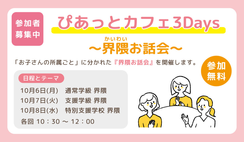 今回のぴあっとカフェでは、「お子さんの所属ごと」に分かれた界隈お話会を開催し... -