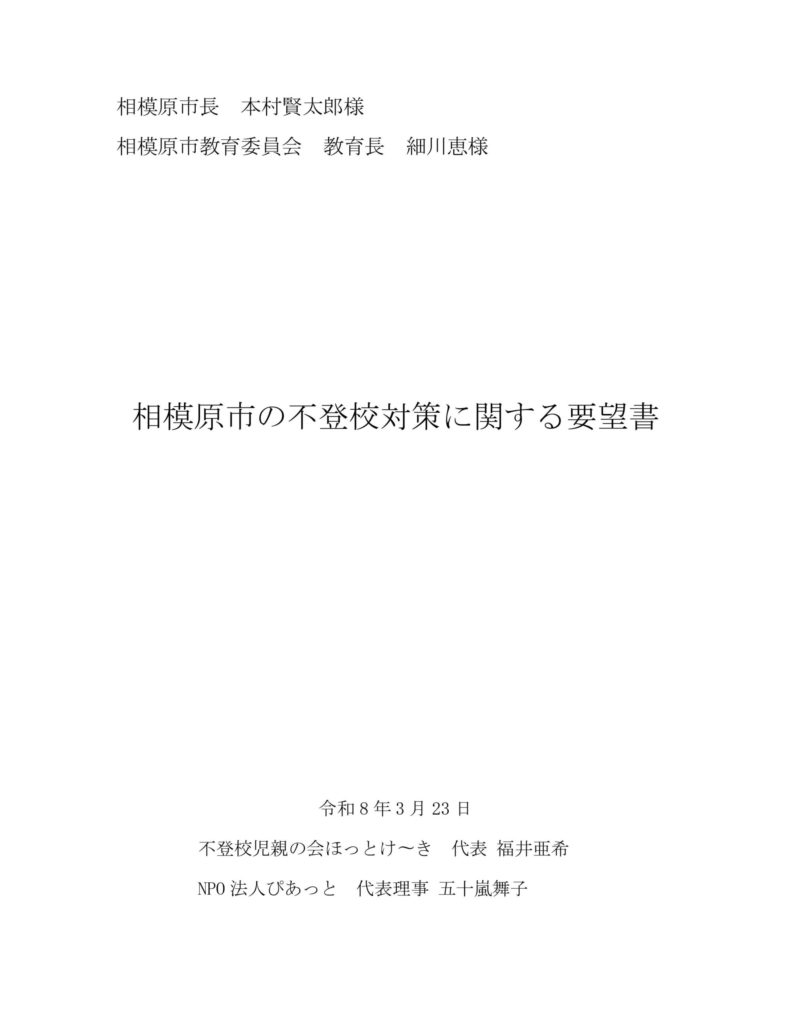 ほっとけ~きさんと連名で、相模原市の不登校対策に関する要望書を提出しました