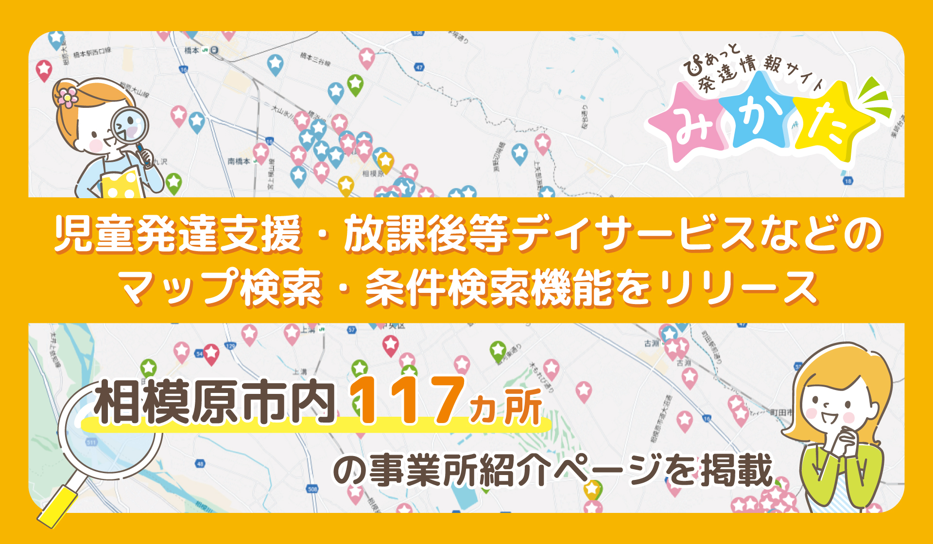ぴあっとが運営する「ぴあっと発達情報サイトみかた」は、相模原市内の児童発達支援・放課後等デイサービス・保育所等訪問支援・障害児相談支援をマップ検索・条件検索で探せる機能をリリースしました。