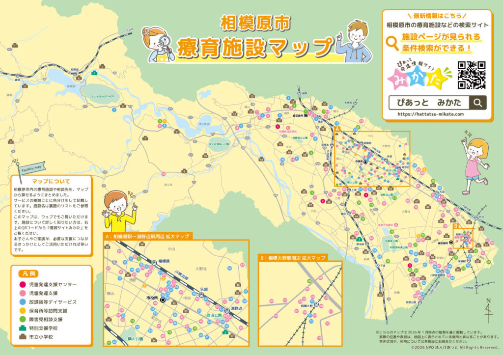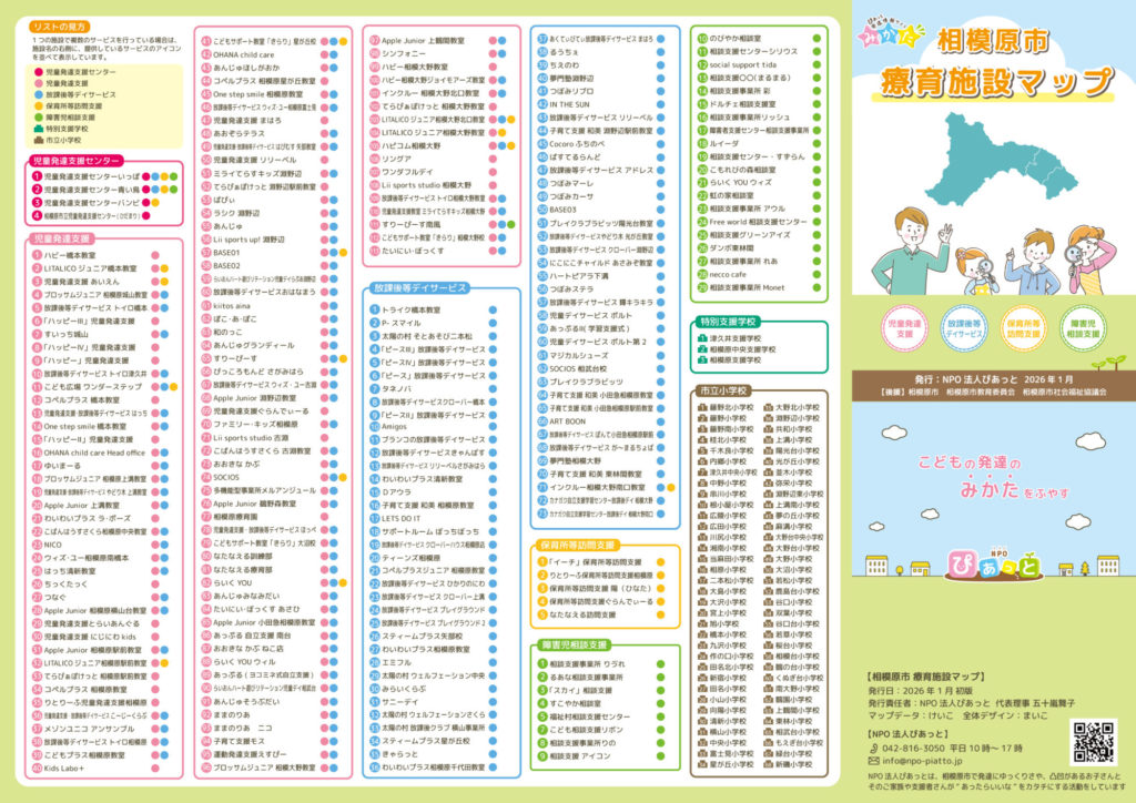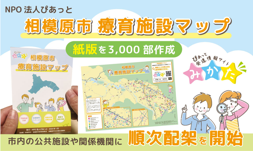 NPO法人ぴあっとでは、相模原市内の療育施設や福祉サービスを一覧で確認できる「相模原市療育施設マップ・紙版」を作成しました。